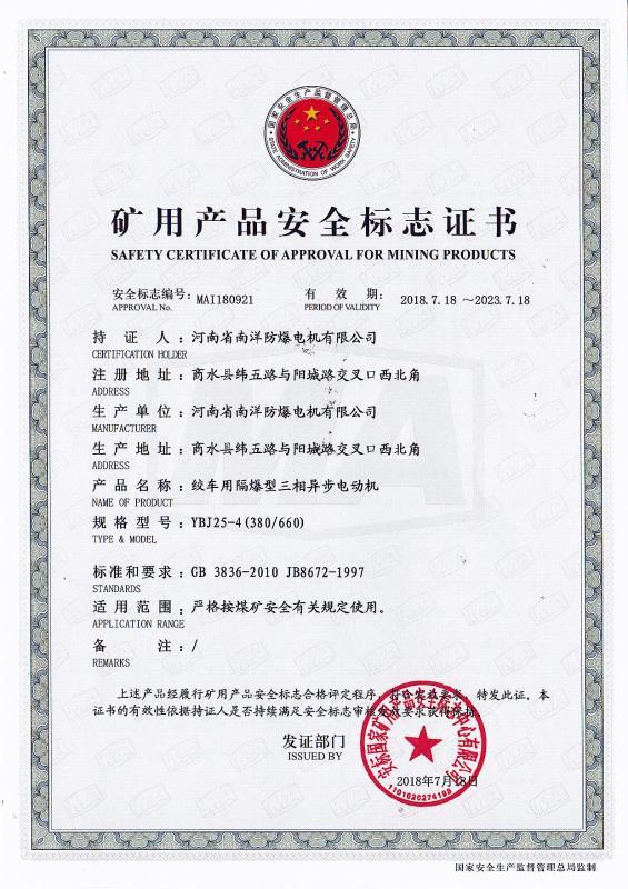 YBJ煤礦井下絞車用隔爆型三相異步電動機防爆合格證